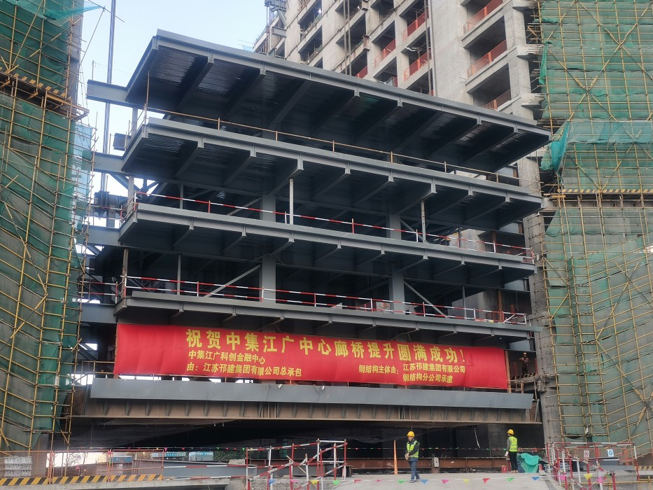 热烈祝贺中集江广中心项目T4钢结构连廊整体提升成功