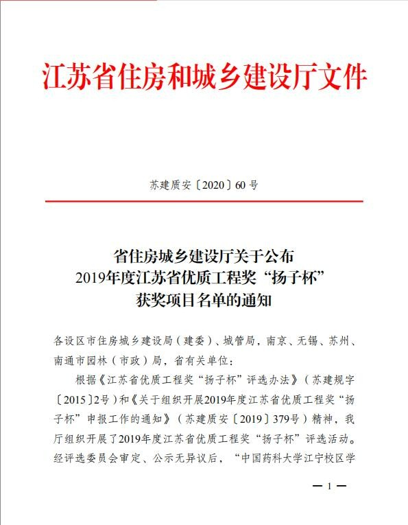 苏建质安〔2020〕60号--2019年度江苏省优质工程奖“扬子杯”获奖项目名单的通知