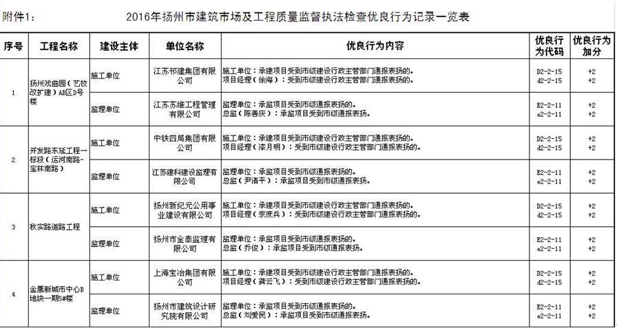 1、对在本次检查中质量行为比较规范,通病防治措施积极落实,实体质量观感较好的扬州文化艺术学校建设的扬州戏曲园(艺校改扩建)AB区D号楼、扬州市市政建设处建设的开发路东延工程一标段(运河南路-宝林南路)、扬州瘦西湖旅游发展集团有限公司建设的秋实路道路工程和扬州金鹰新城市中心开发有限公司建设的金鹰新城市中心B地块一期5#楼项目给予通报表扬,同时给予施工、监理单位及相应人员优良行为记录,具体内容详见附件一。