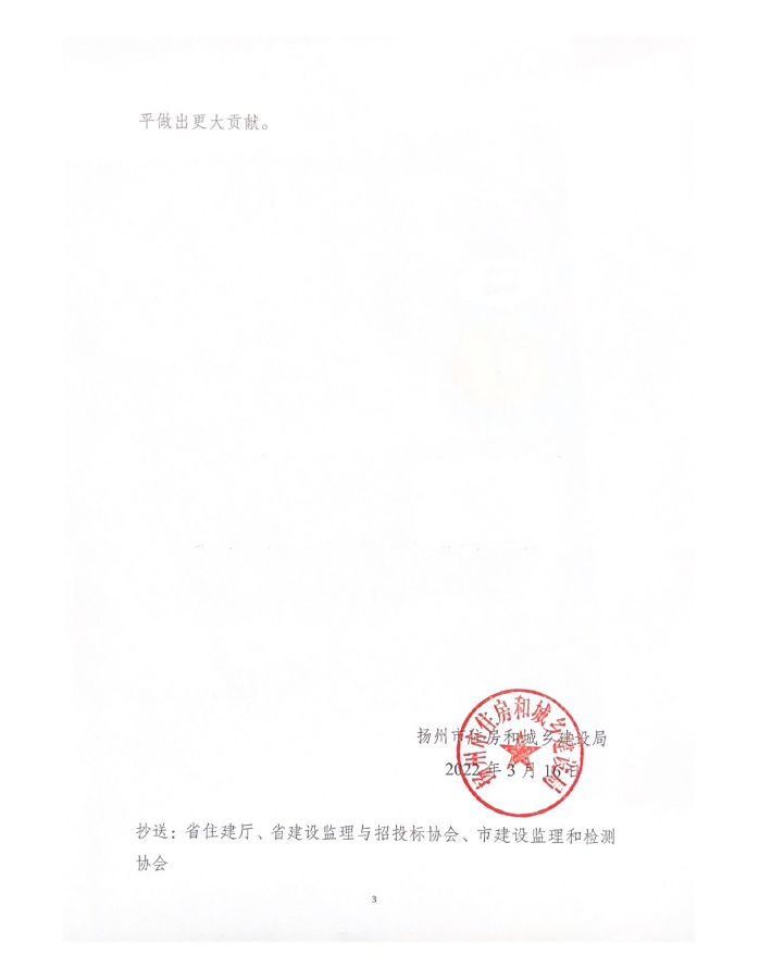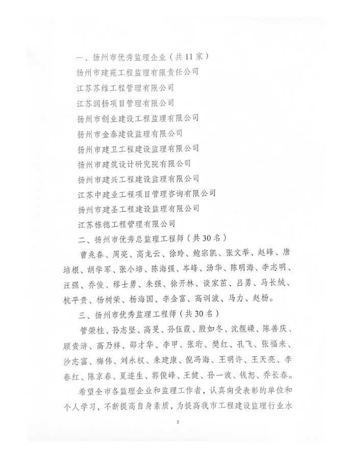 近日,扬州市住建局公布《关于表彰2021年度扬州市“优秀监理企业”、“优秀总监理工程师”和“优秀监理工程师”的通知》,经评审,我司获得“2021年度扬州市优秀监理企业”;高训波、杨海国、杭平贵、杨树荣、李金富、马长绒同志被评为“2021年度扬州市优秀总监理工程师”, 王健、孙一波同志被评为“2021年度扬州市优秀监理工程师”。