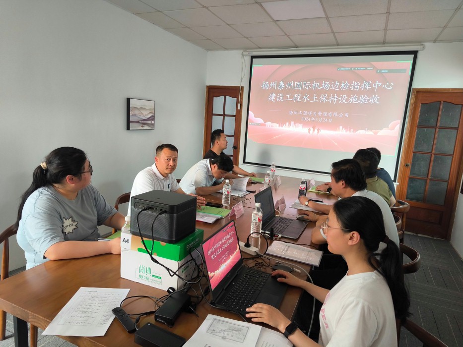 2024年5月24日,扬州泰州国际机场边检指挥中心项目召开水土保持设施验收会议,建设单位、项目管理、设计单位、监理单位、施工单位、方案监测单位等参建单位相关人员,以及扬州水文局徐明处长参加验收会议。