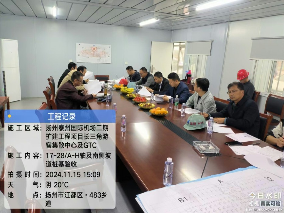 2024年11月15日下午,扬泰机场二期GTC桩基工程17-28/A-H轴及南侧坡道验收,市质监站与各参建单位对现场桩基轴线、标高进行查勘复核,全部符合设计和规范要求,检测报告合格资料齐全,同意通过此区域桩基验收。