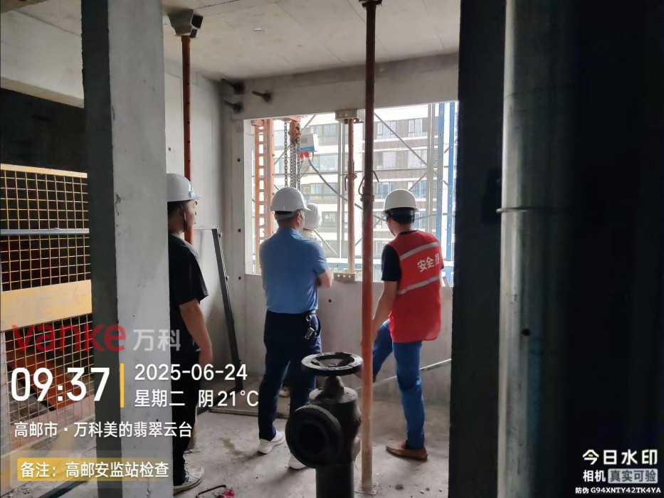 2025年6月24日,高邮市安监站围绕第24个全国“安全生产月”主题“人人讲安全、个个会应急——查找身边安全隐患”,对云台嘉园12#楼、13#楼项目开展专项检查。检查组重点巡检了施工现场安全措施、施工电梯运行状况、塔吊稳定性、临时用电规范性及消防设施配备情况,测试临边栏杆的稳固性,测试施工电梯的超载保护和限位装置,核查塔吊的平衡性和基础稳固,审查临时用电线路的接地保护及漏电开关功能,并检查消防栓、灭火器的配备与有效性。会上要求项目确保安全达标,强调务必要宣贯安全月精神,时刻落实安全生产责任。