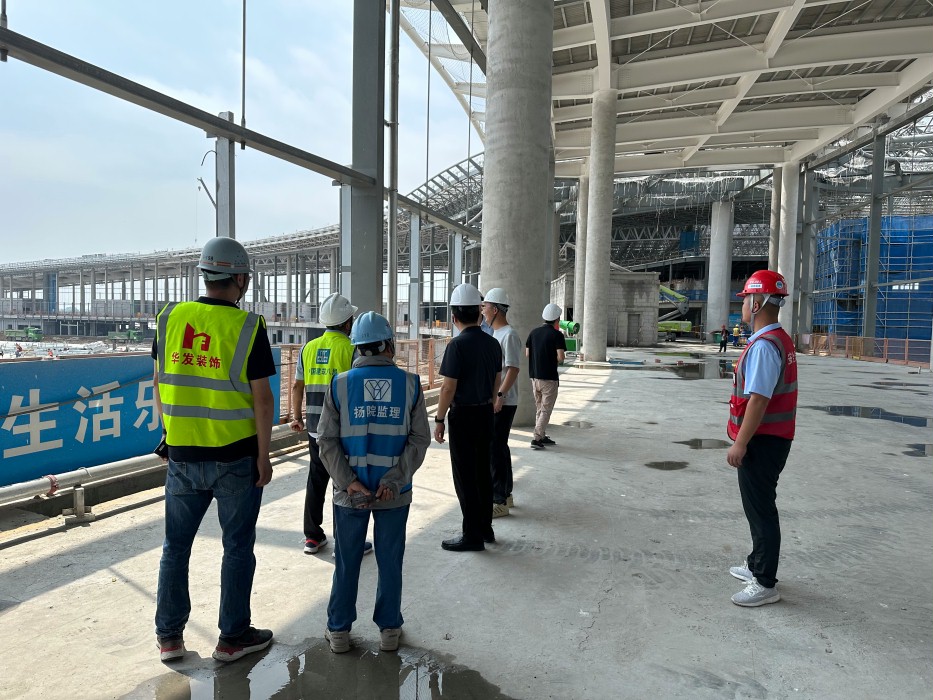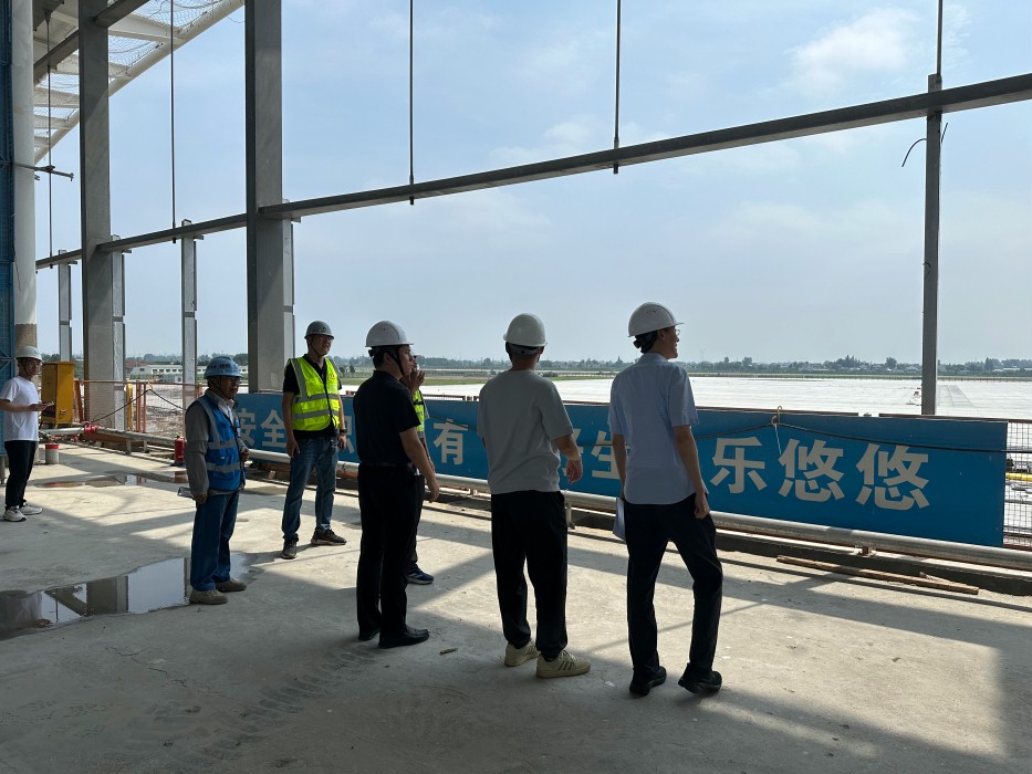 2025年6月27日,扬州市规划局吴处长率江都分局陈副局长一行,赴扬州泰州国际机场二期扩建工程航站楼建设工地开展实地调研指导。