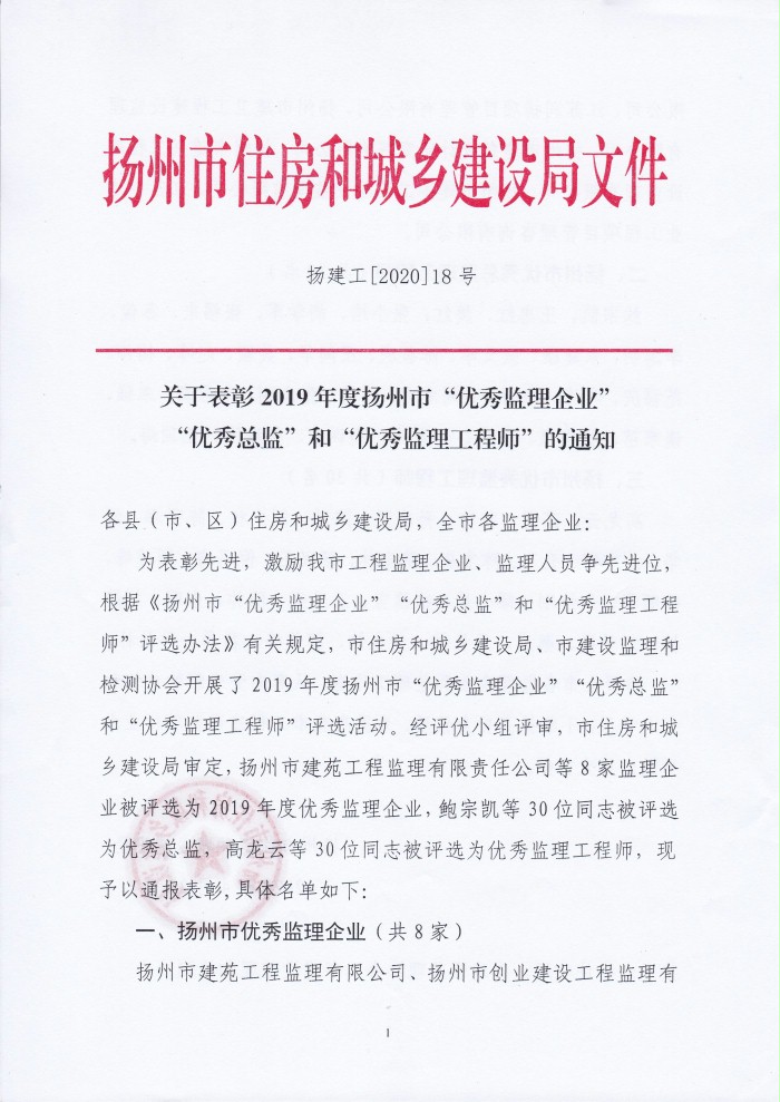 关于表彰2019年度扬州市“优秀监理企业”“优秀总监”和“优秀监理工程师”的通知