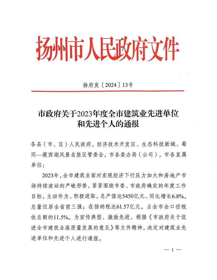 喜报!我司荣获2023年度“扬州市建筑业先进企业”称号
