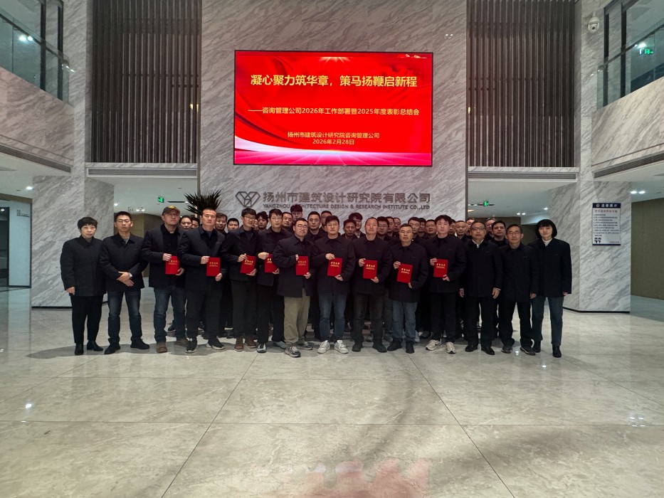 2月28日,扬州市建筑设计研究院咨询管理公司2026年工作部署暨2025年度表彰大会圆满举行。公司总经理高训波同志、公司管理层、部门负责人及先进员工代表齐聚一堂,共绘发展蓝图。