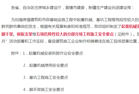 《关于印发起重机械、基坑工程等五项危险性较大的分部分项工程施工安全要点的通知