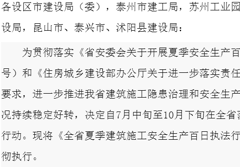 2017.07.25各设区市建设局(委),泰州市建工局,苏州工业园区规划建设委员会、张家港保税区规划建设局,昆山市、泰兴市、沭阳县建设局:为贯彻落实《省安委会关于开展夏季安全生产百日执法行动的通知》(苏安〔2017〕16号...