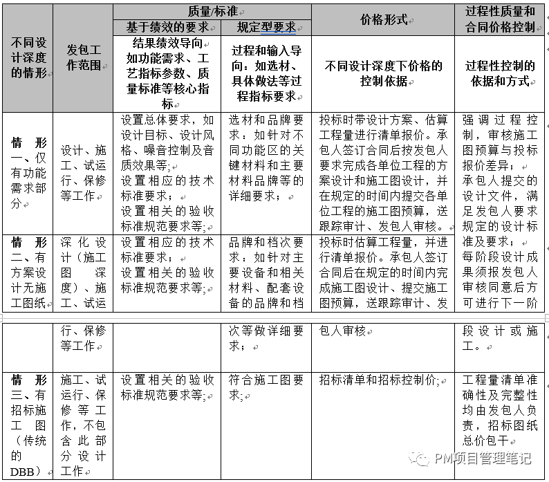 工程总承包项目中,不同设计深度的发包人要求,承包范围以及相应的造价管控重点存在较大差异。如常见的:仅有功能需求、有方案设计无施工图纸情形、有设计招标施工图。