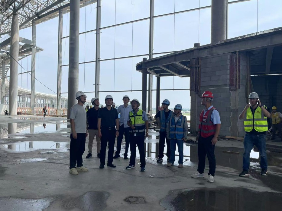 2025年6月27日,扬州市规划局吴处长率江都分局陈副局长一行,赴扬州泰州国际机场二期扩建工程航站楼建设工地开展实地调研指导。