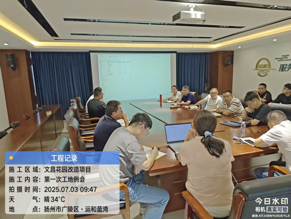 2025年7月3日由扬州市运宏旧城改造建设发展有限公司陈旭主任主持召开了文昌花园老旧小区改造工程第一次工地会议及设计交底会议,广陵区住建局、扬州市海绵办、设计单位、跟踪审计单位、监理单位、施工单位负责人共同参会,会议对前期准备情况进行了汇报,并对前期手续、高温期施工、安全文明施工、扬尘管控、工程质量、整体进度、投资管控、外部协调等方面的工作进行了部署与要求。