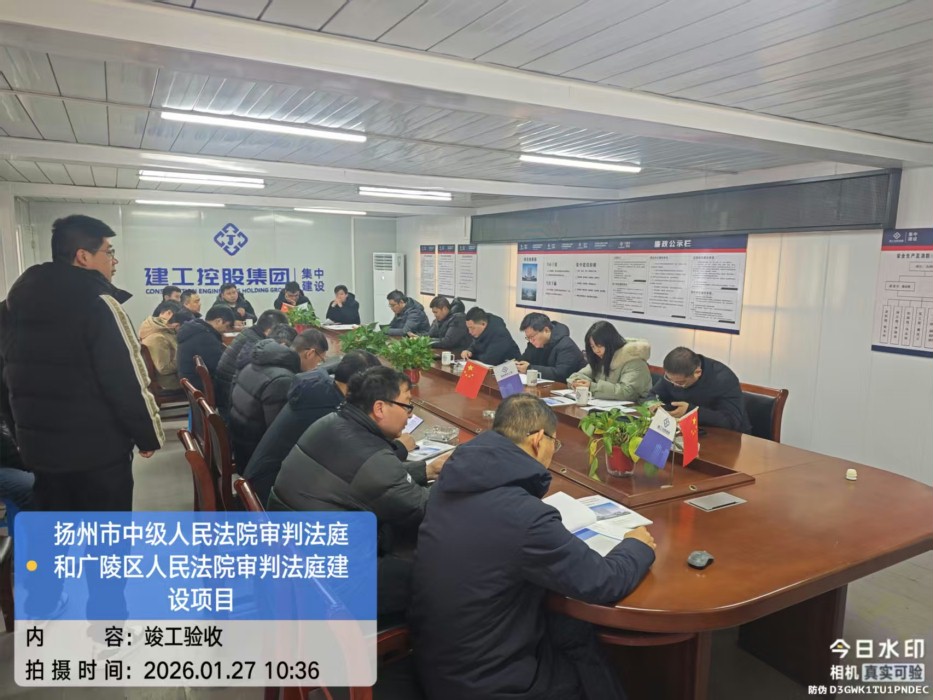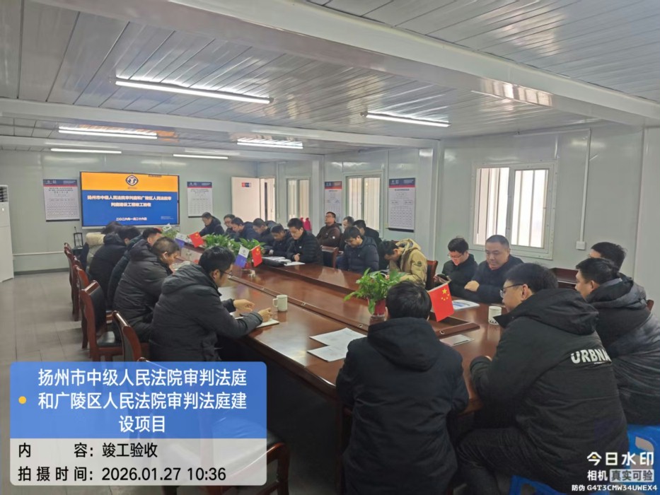 2026年1月27日上午,由我司负责全过程咨询管理的扬州市中级人民法院审批法庭及广陵区人民法院审批法庭项目在现场会议室组织召开了竣工验收专题会议,参建单位五方责任主体负责人和邗江区质安站吴庭军、江新宇参加了本次会议。经过现场查勘及资料检查,对现场质量和资料总体满意,一致同意通过竣工验收。