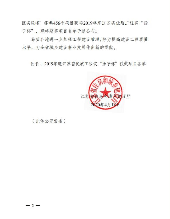 苏建质安〔2020〕60号--2019年度江苏省优质工程奖“扬子杯”获奖项目名单的通知