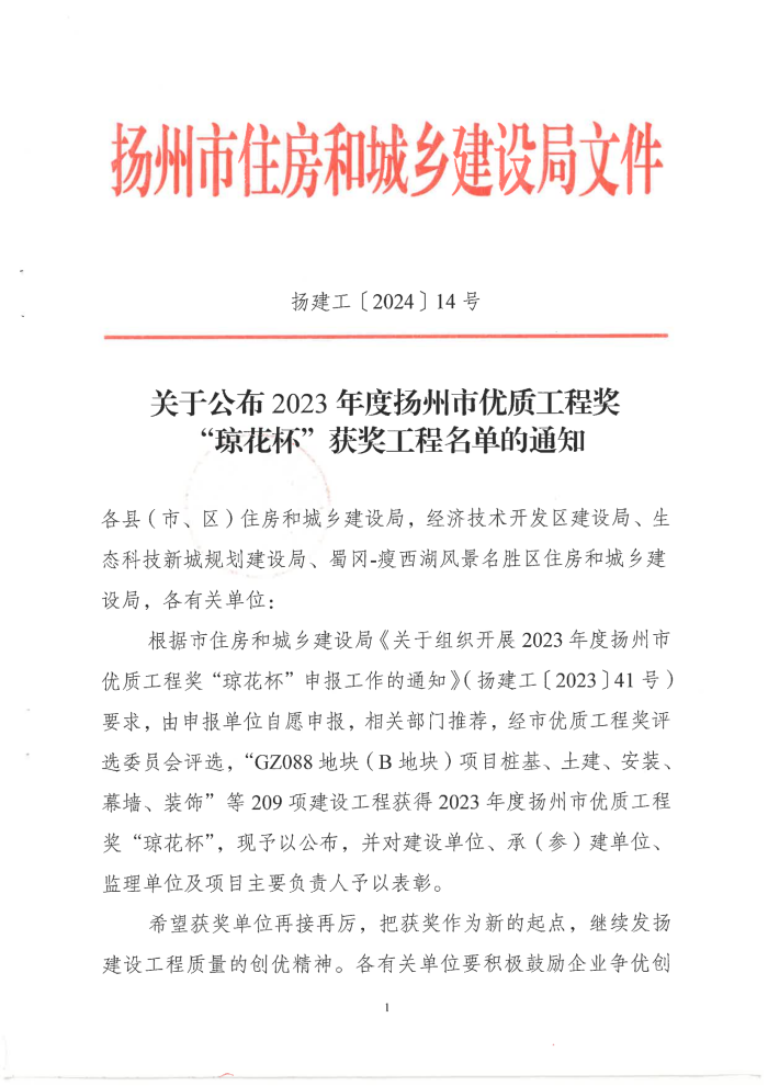 “琼花杯”旨在提升全市建设工程的质量水平,并激励广大工程建设企业强化质量管理,积极追求工程卓越。坚持高标准施工和严格管理,成功打造出多项精品工程,展望未来,我公司将继续坚守高质量导向,不断提升工程管理和监理水平,严格监理验收标准和要求,创造更多优质工程,为扬州市建筑业的高质量发展贡献力量。