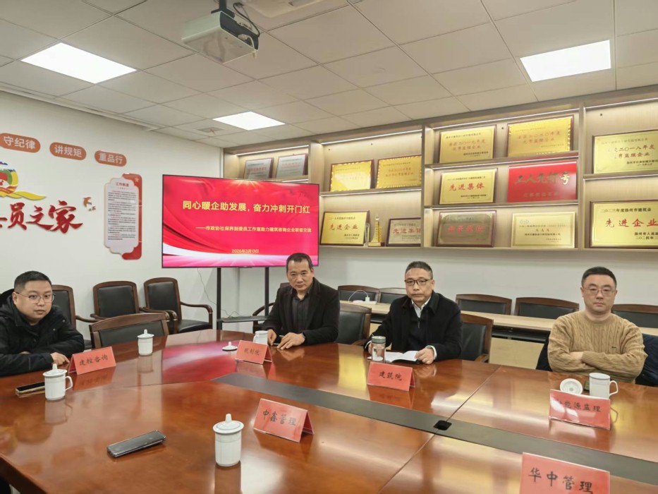 会议在位于扬州市建筑设计研究院的“社会福利和社会保障界别政协委员工作室”举行。市规划院、建控咨询、中鑫管理、新能源监理、建厦监理、华中管理、万茂管理等多家行业企业代表齐聚一堂,围绕当前政策形势、行业转型与企业协作展开热烈讨论。